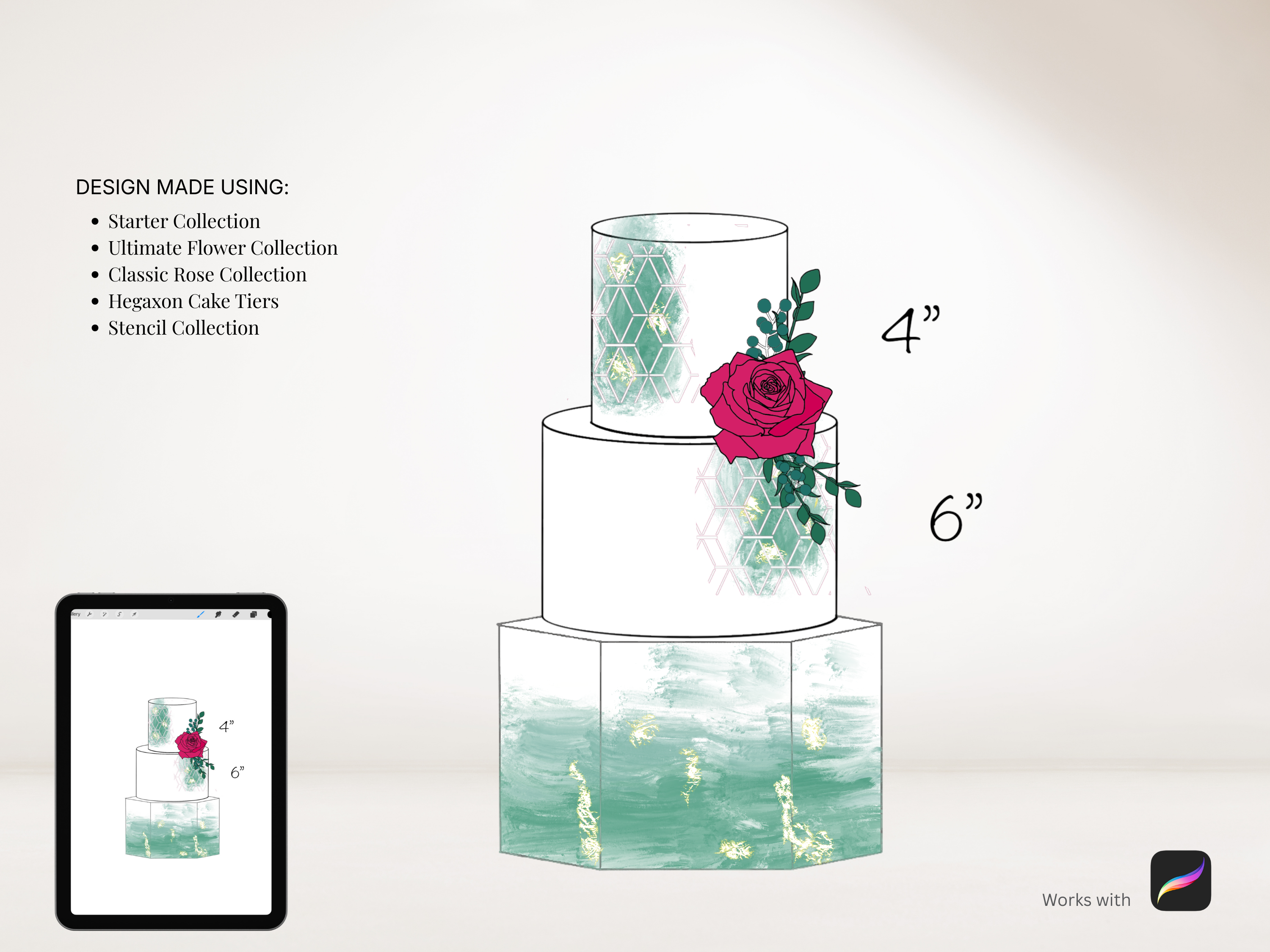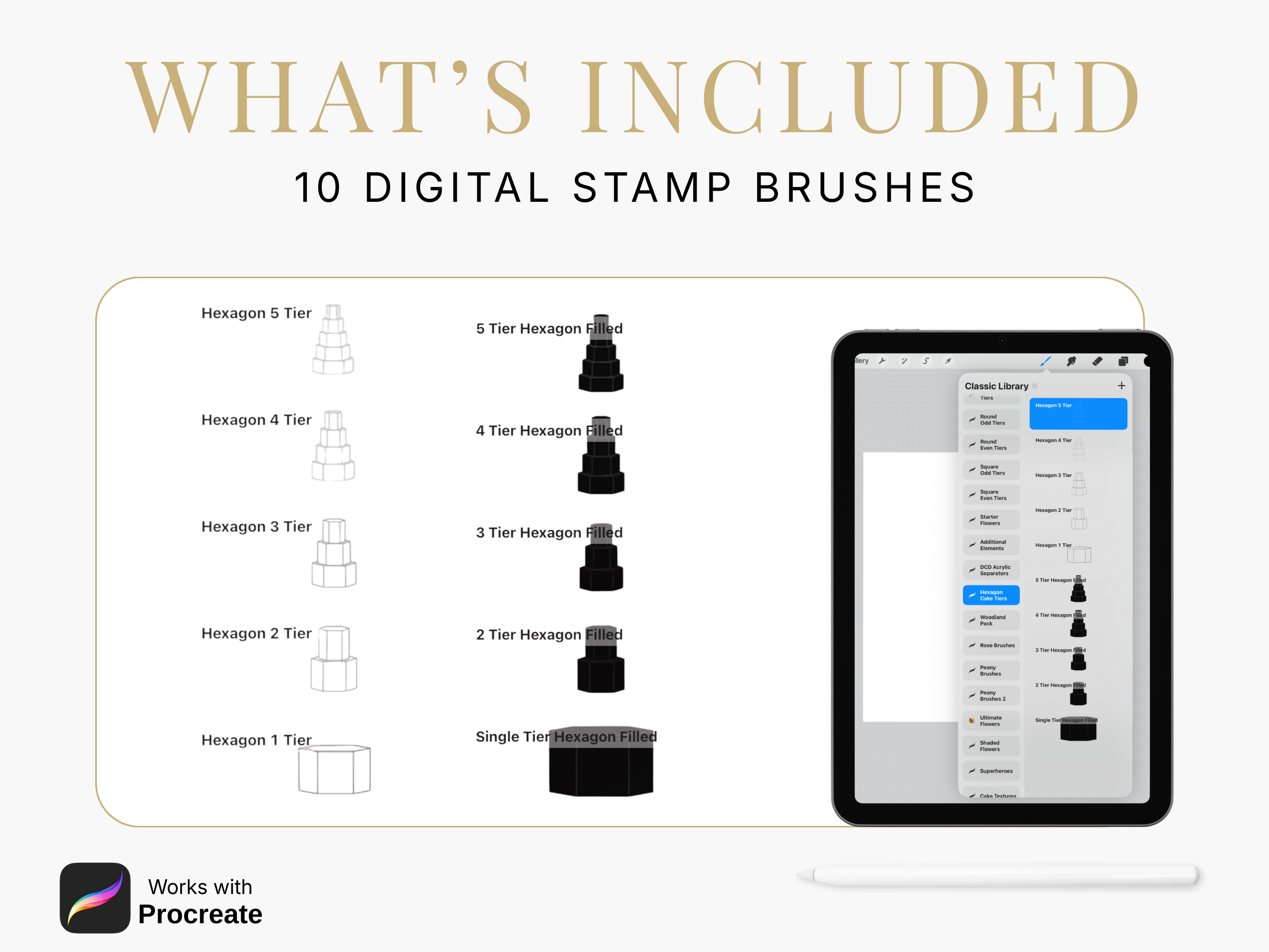 This set of Procreate brushes contains hexagon shape cake tiers. From a single tier, up to 5 tiers.