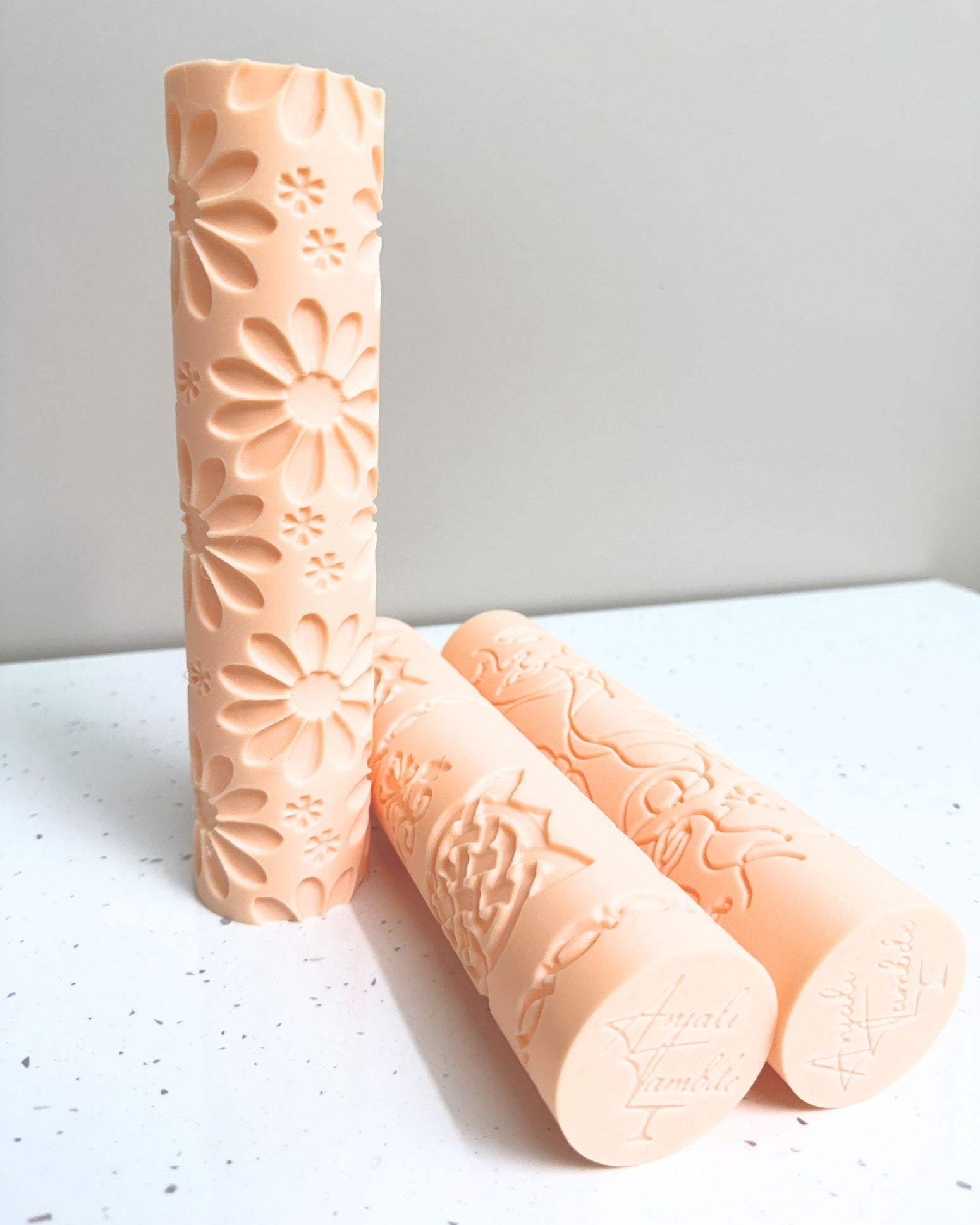 This is where her rolling pin collections come in—designed as a bridge between her worlds. Each rolling pin is created to translate the beauty of weaves, the richness of traditional pattern, the movement of brushstrokes, and the poetry of nature into edible texture. The result is a tool that doesn’t just emboss a design, it helps you create couture-inspired cakes with depth, narrative, and a signature finish. Whether you’re imprinting delicate florals, regal bird motifs, or textile-like borders, these designs are made to elevate your work with a refined, luxury impression turning every bake into a piece of art.