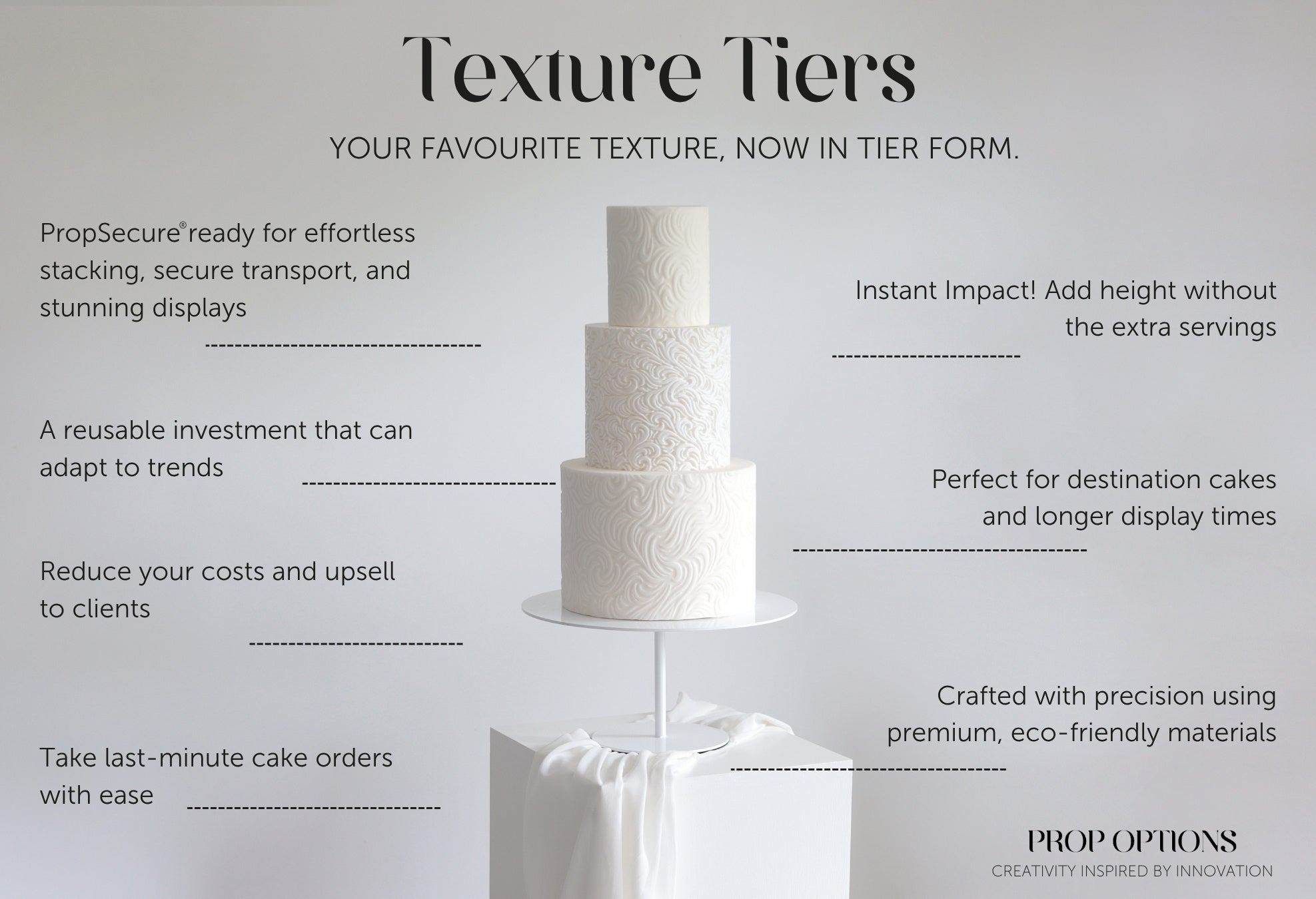 Made for stylists who want to add structure and texture without adding weight. The Full Bloom design is inspired by our bestselling Rolling Pin design and creates a clean break between tiers, introducing visual depth to your setup. Simple to stack and strong enough for real or dummy cakes.