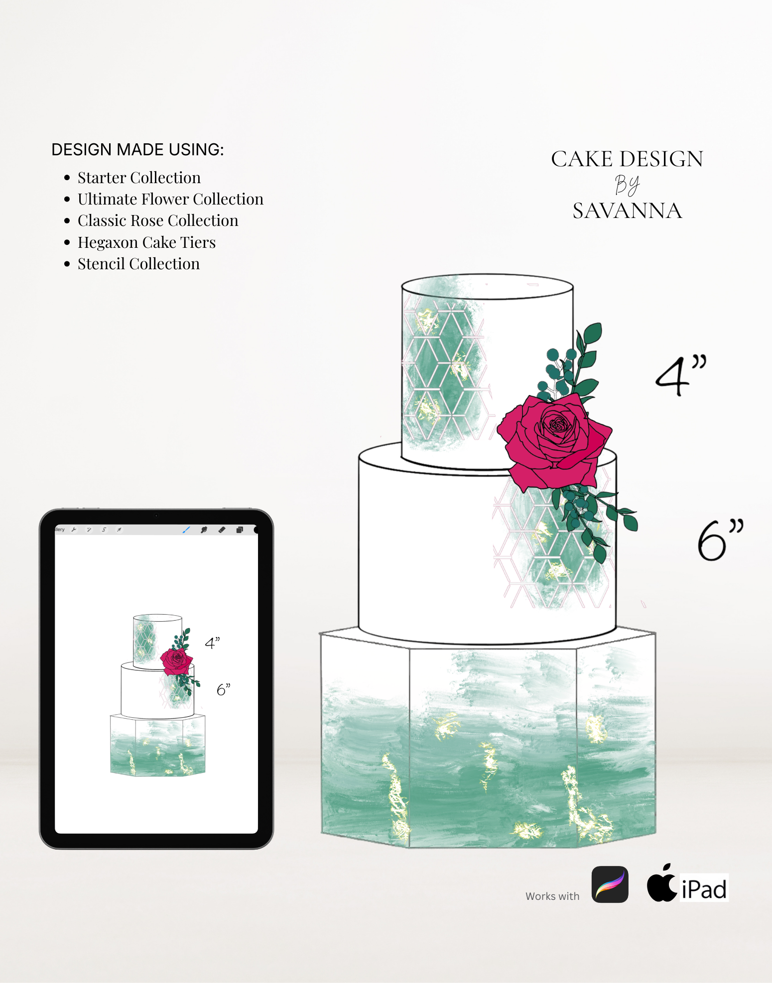 This set of Procreate brushes contains hexagon shape cake tiers. From a single tier, up to 5 tiers.