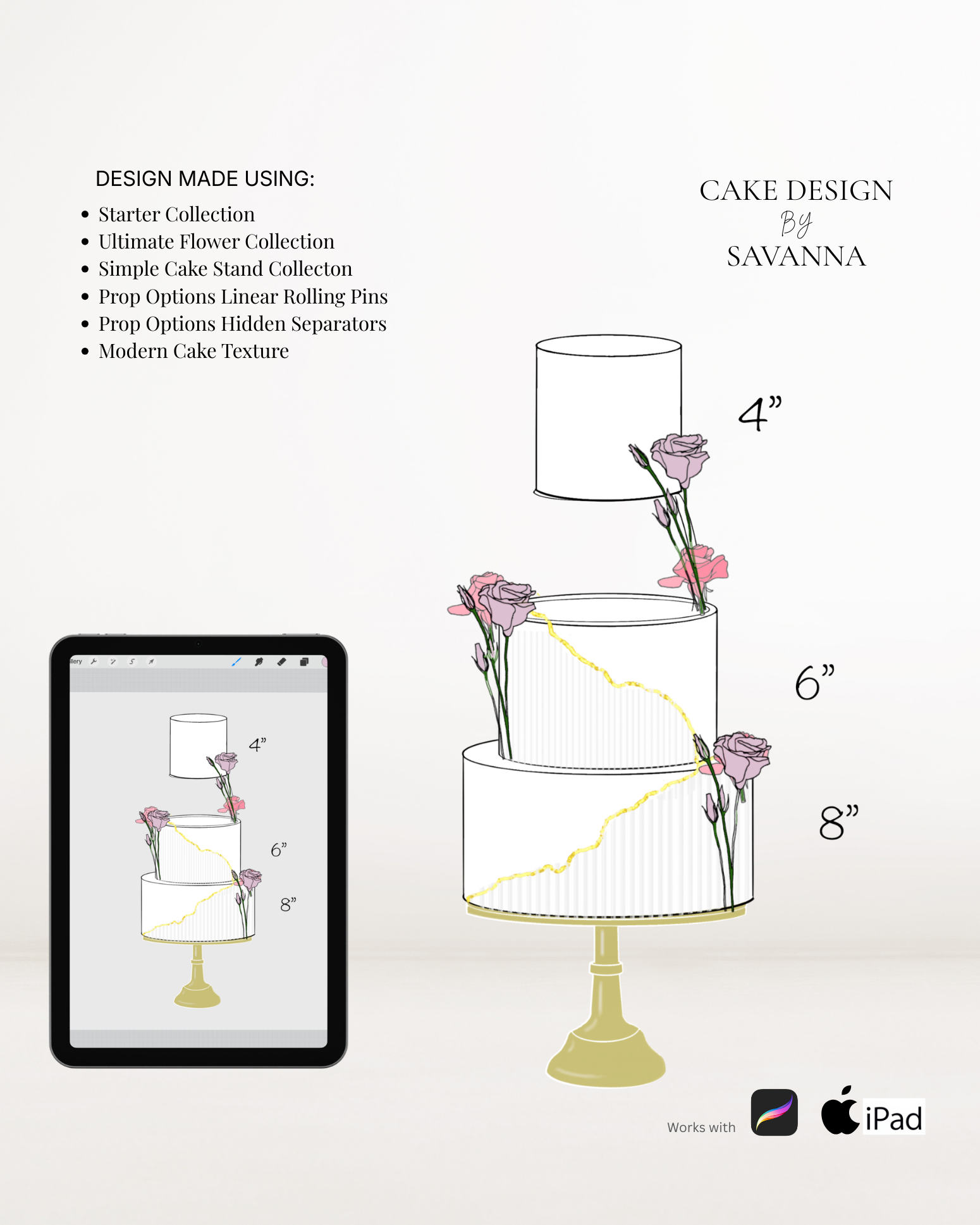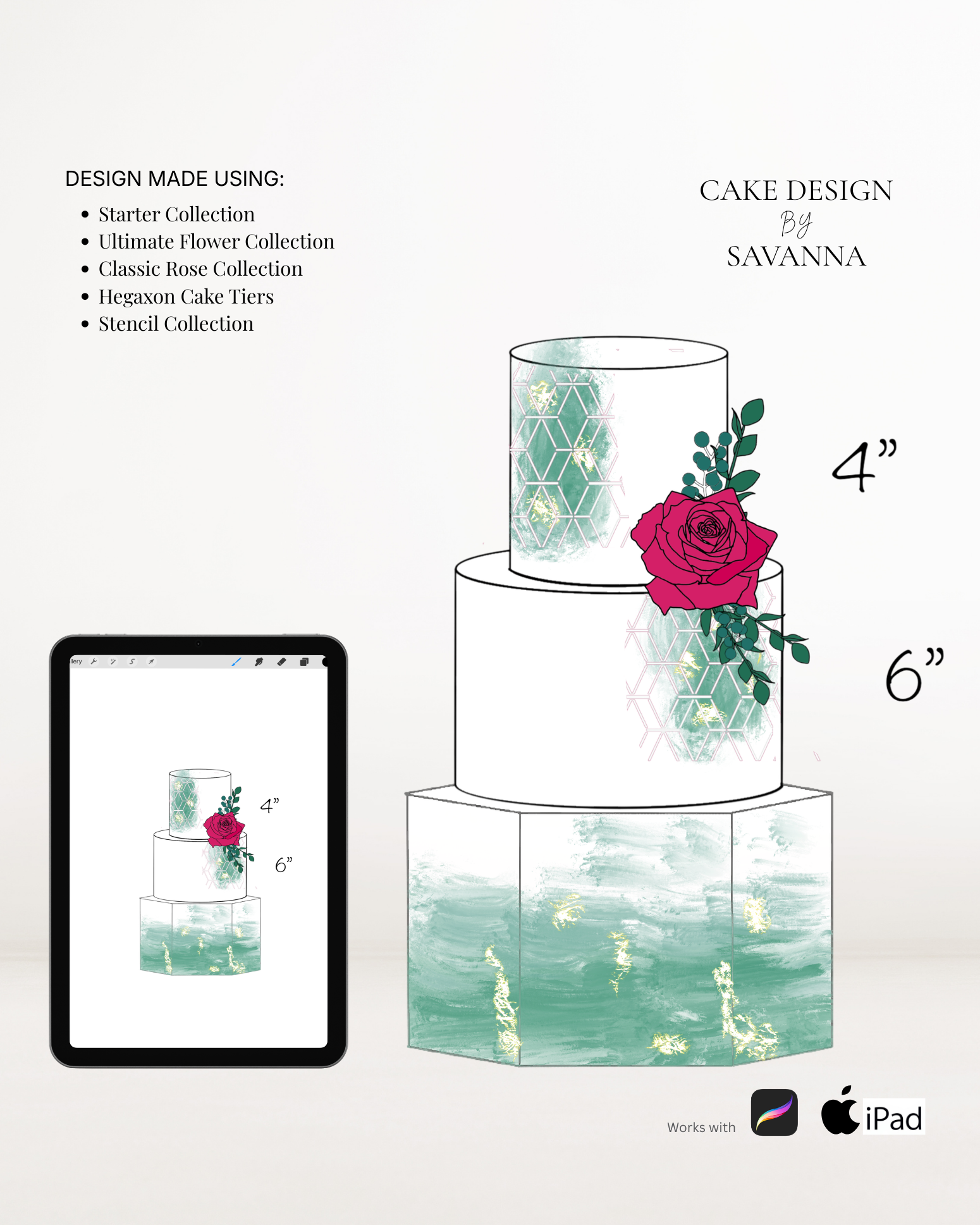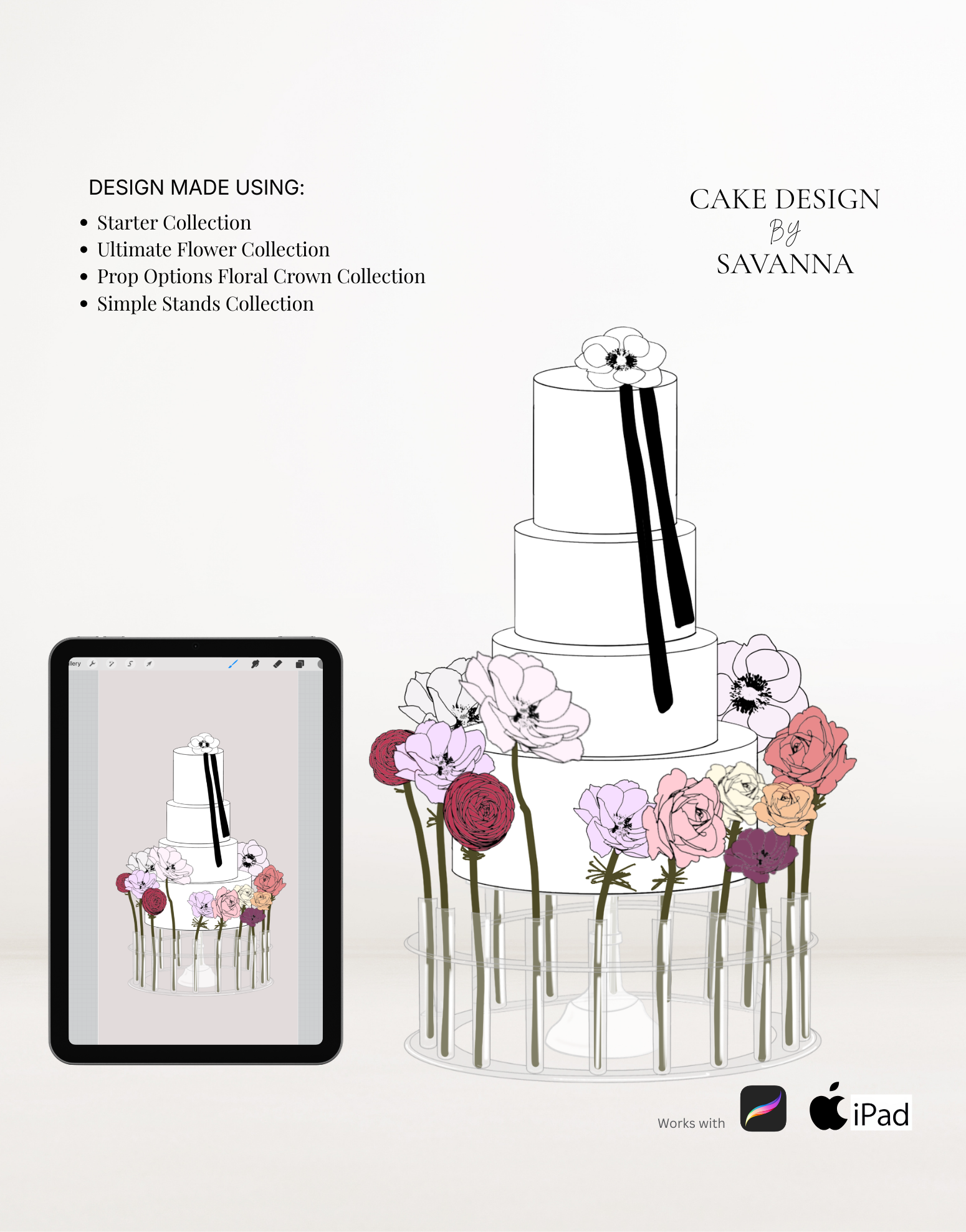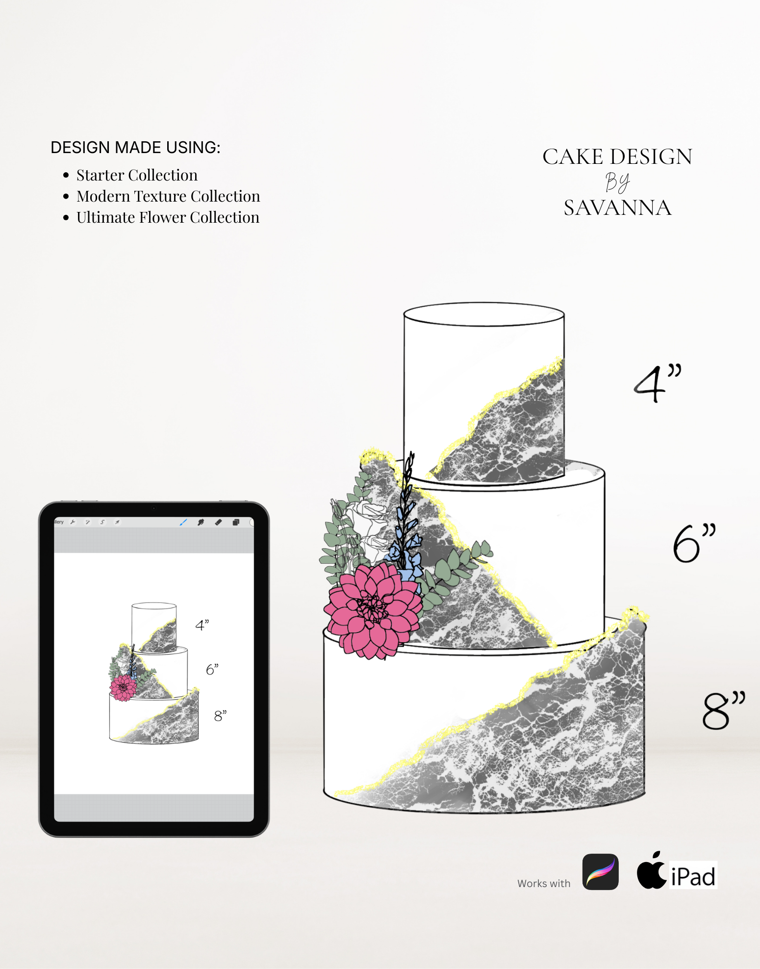 From digital Procreate stamp sets and ready-designed packages to future physical design tools, Cake Design by Savanna exists to remove repetitive work, streamline workflows, and enhance how cake designs are presented to clients.