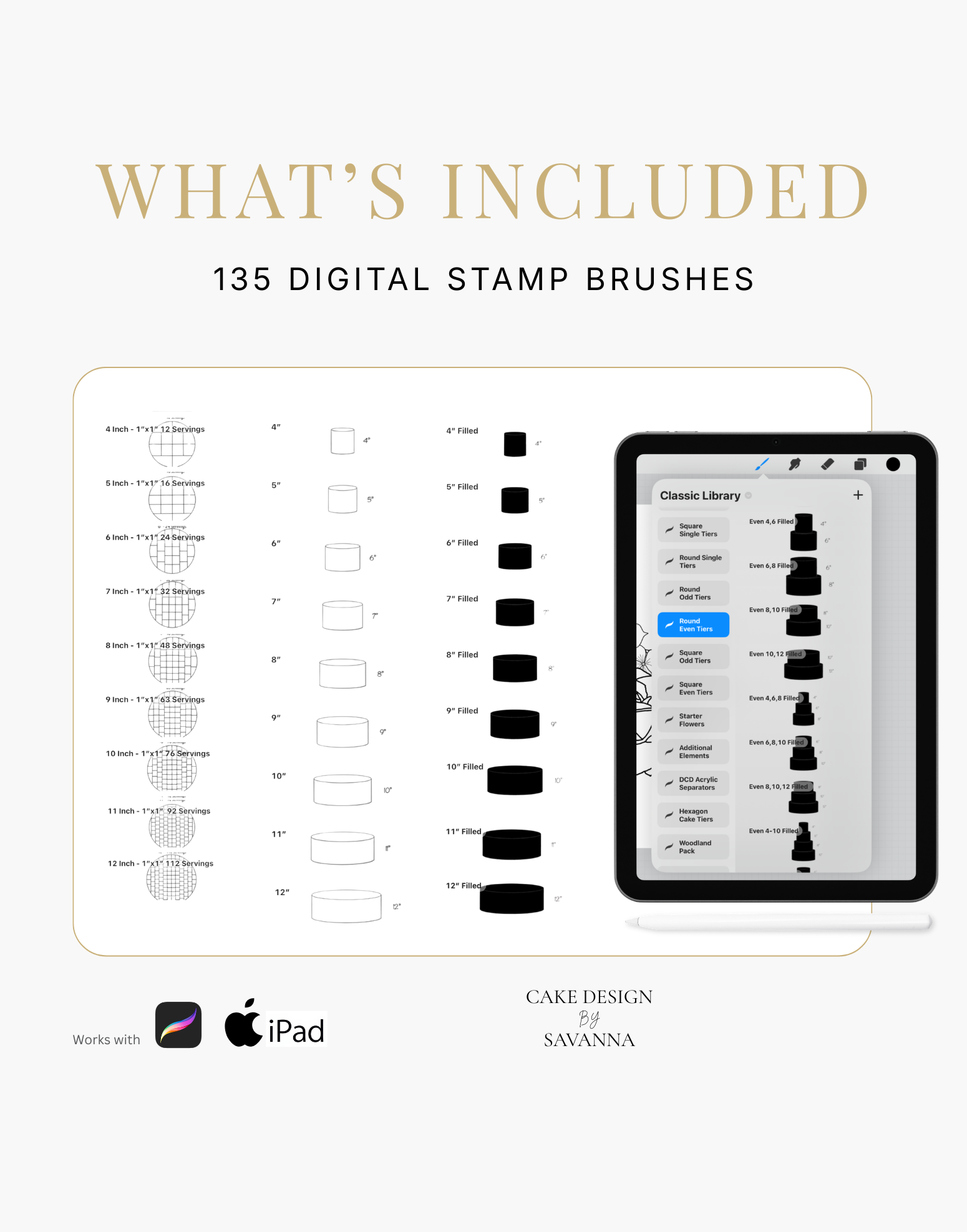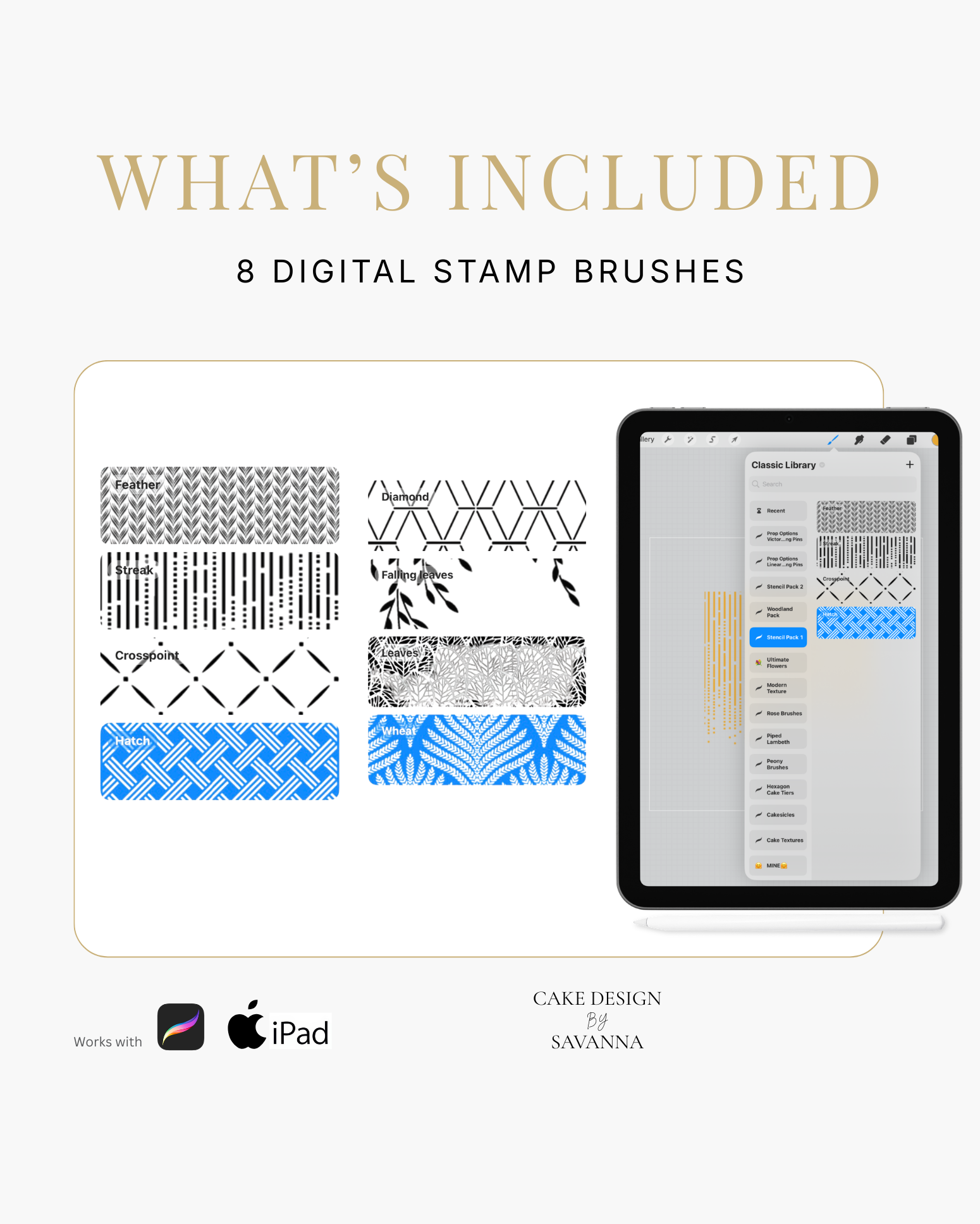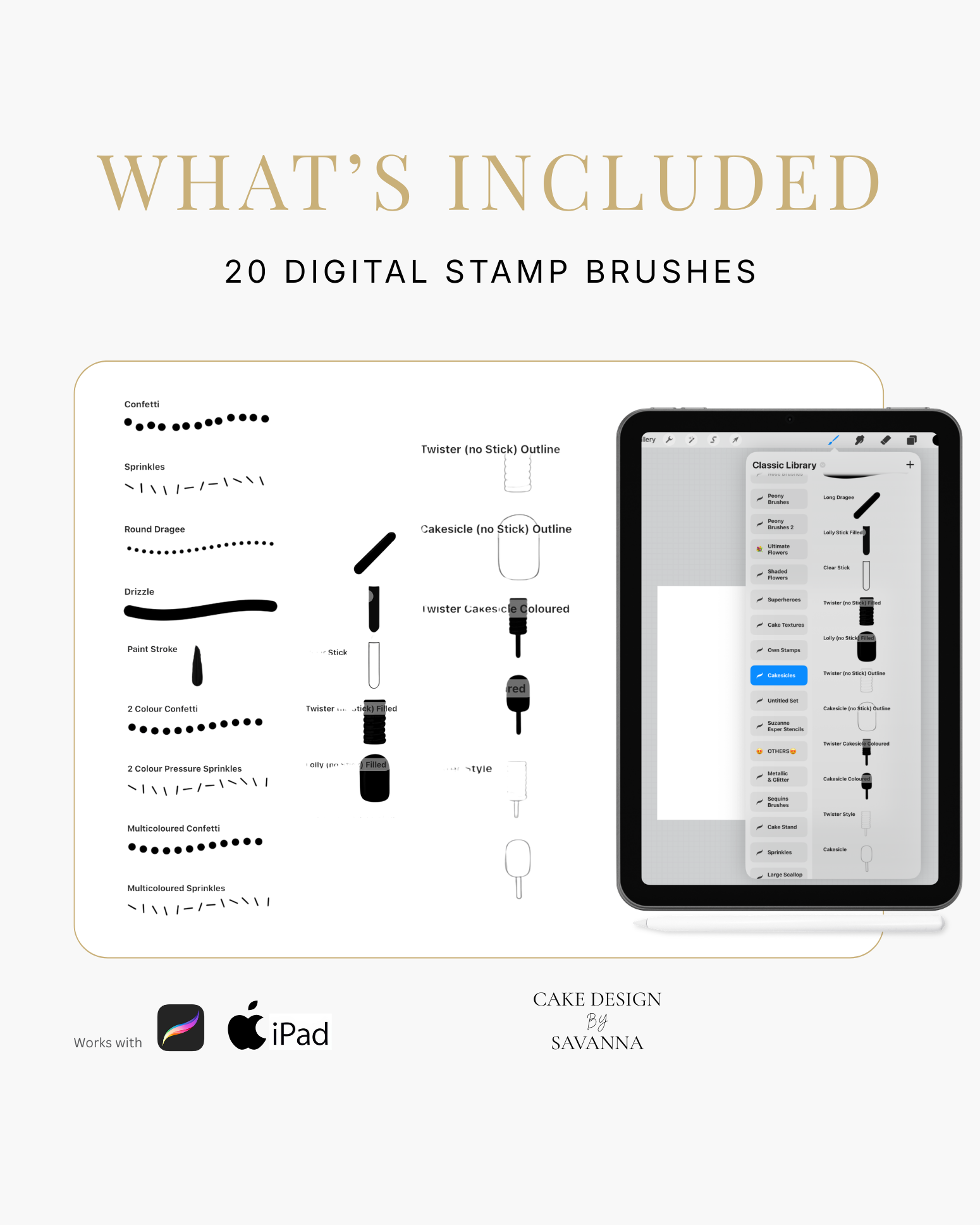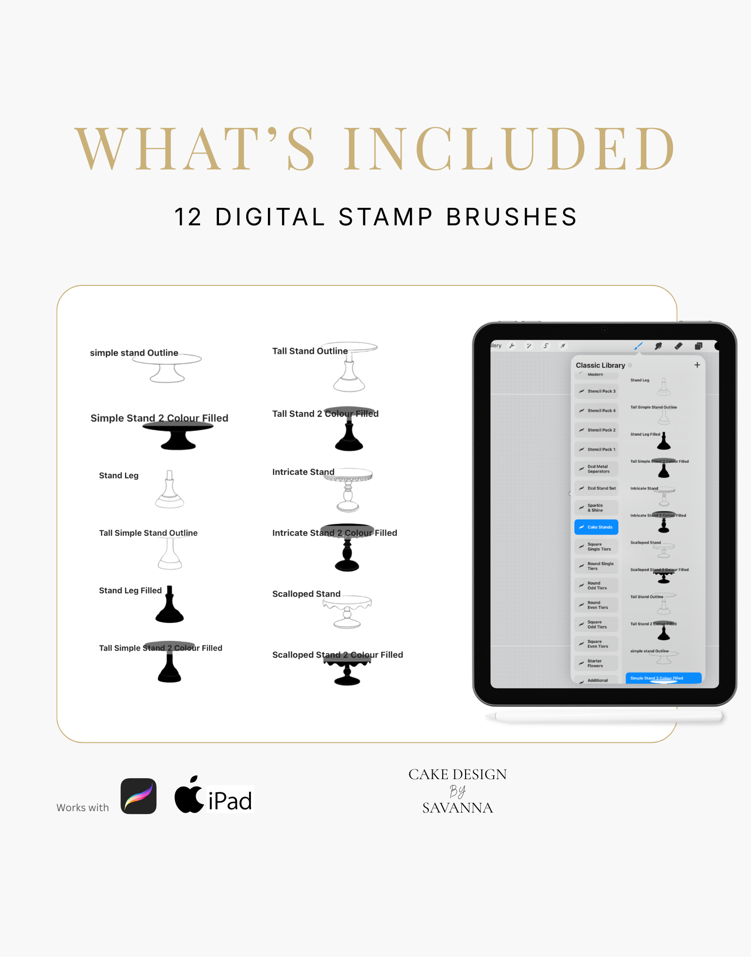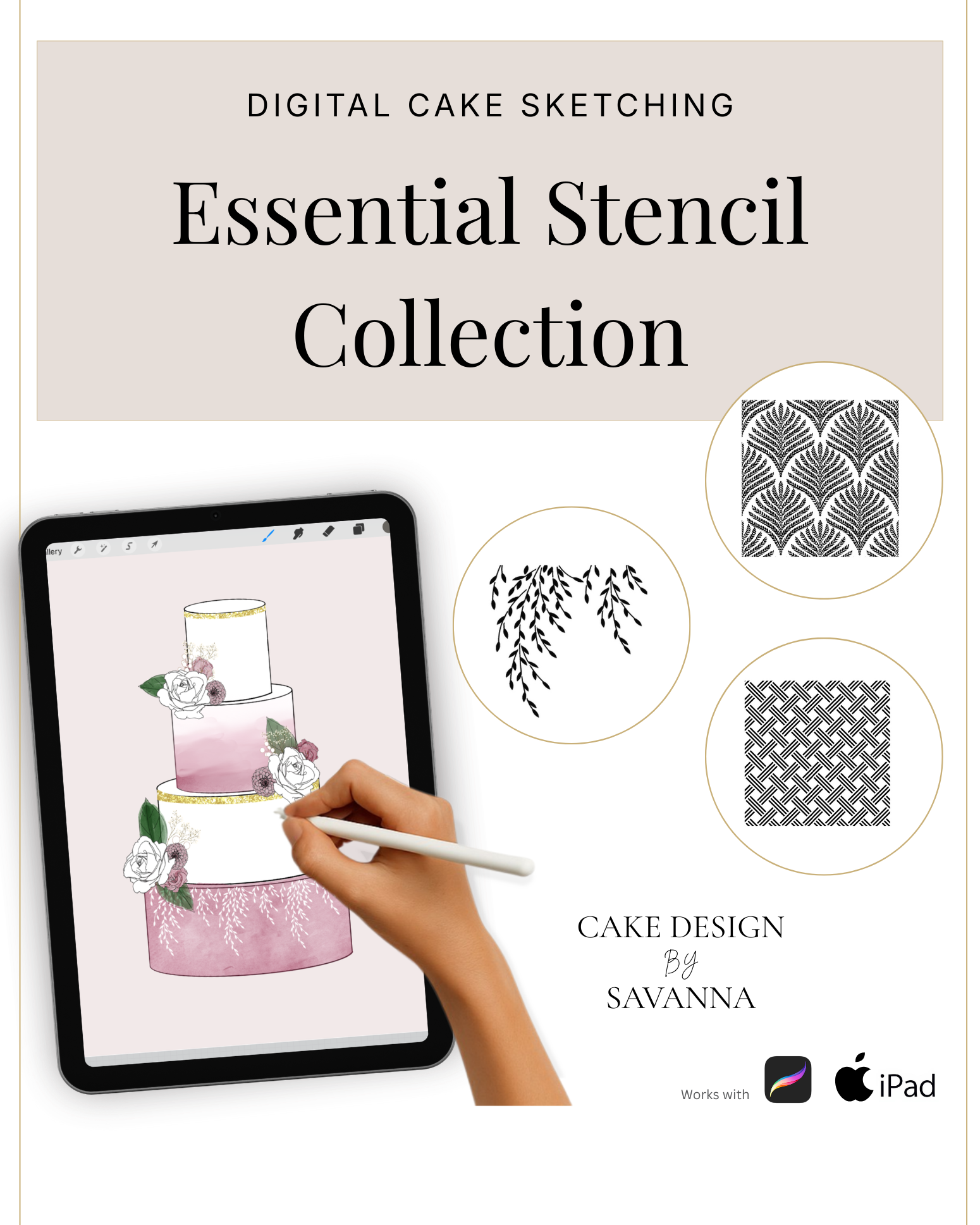 Turn your creative cake ideas into polished design visuals. Specialist stamps and brushes pair with the Procreate app on iPhone and iPad to sketch, refine, and present stunning cake designs with ease.