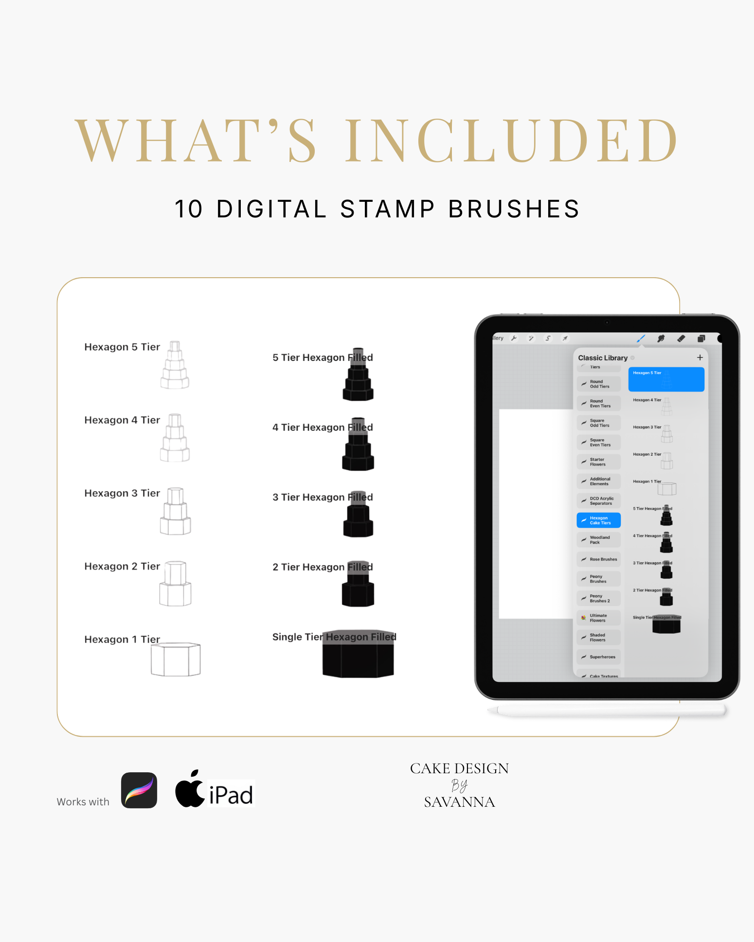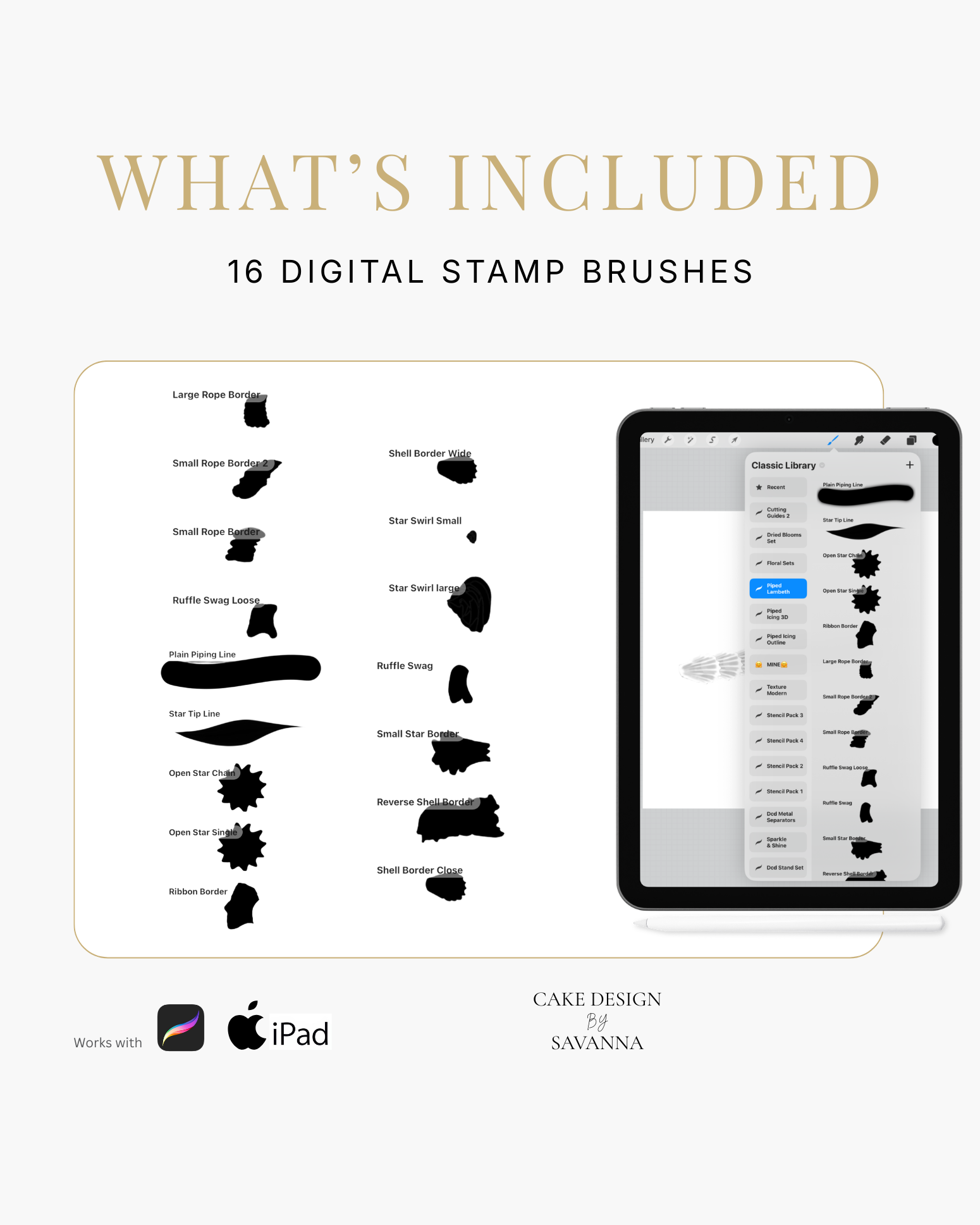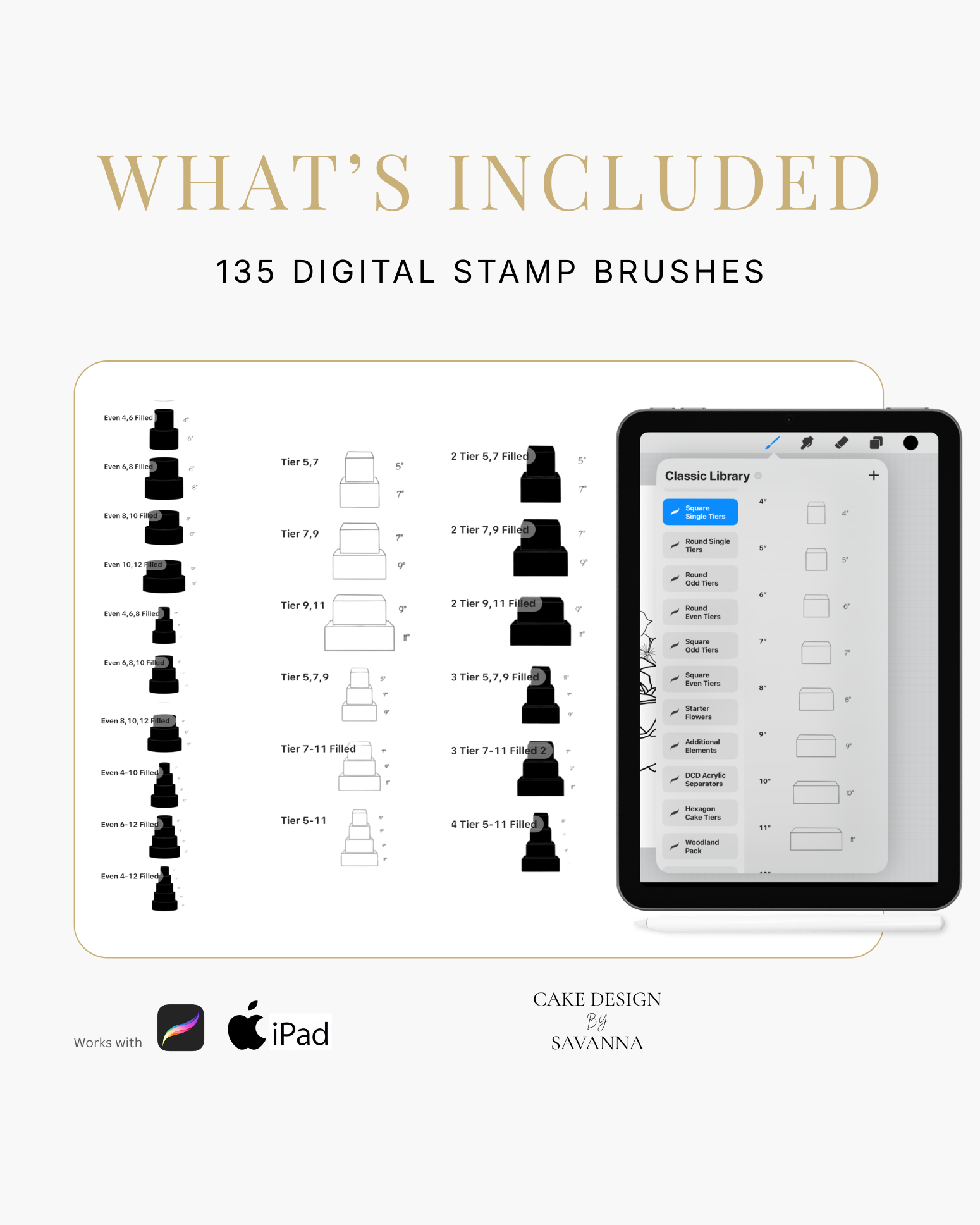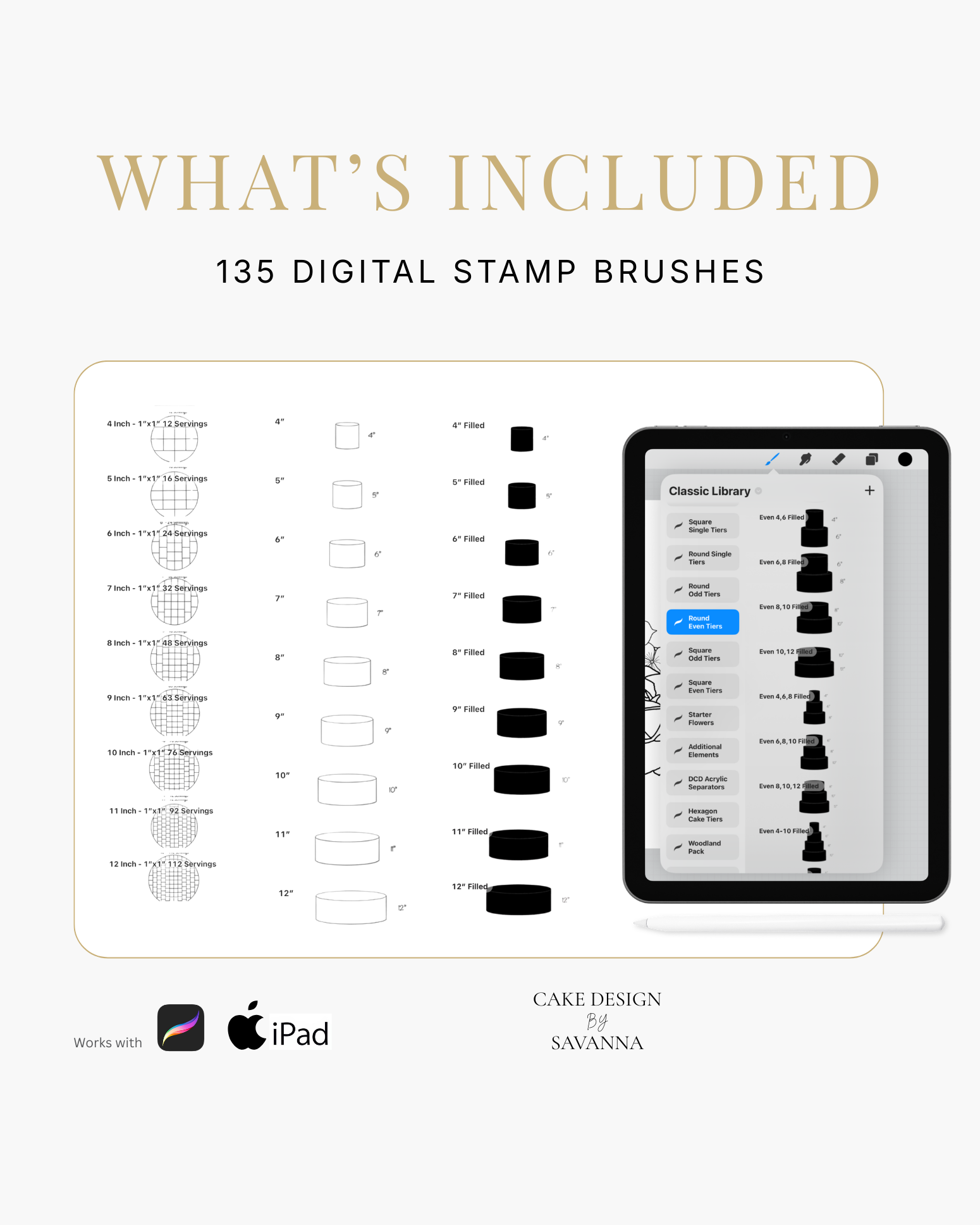 Turn your creative cake ideas into polished design visuals. Specialist stamps and brushes pair with the Procreate app on iPhone and iPad to sketch, refine, and present stunning cake designs with ease.
