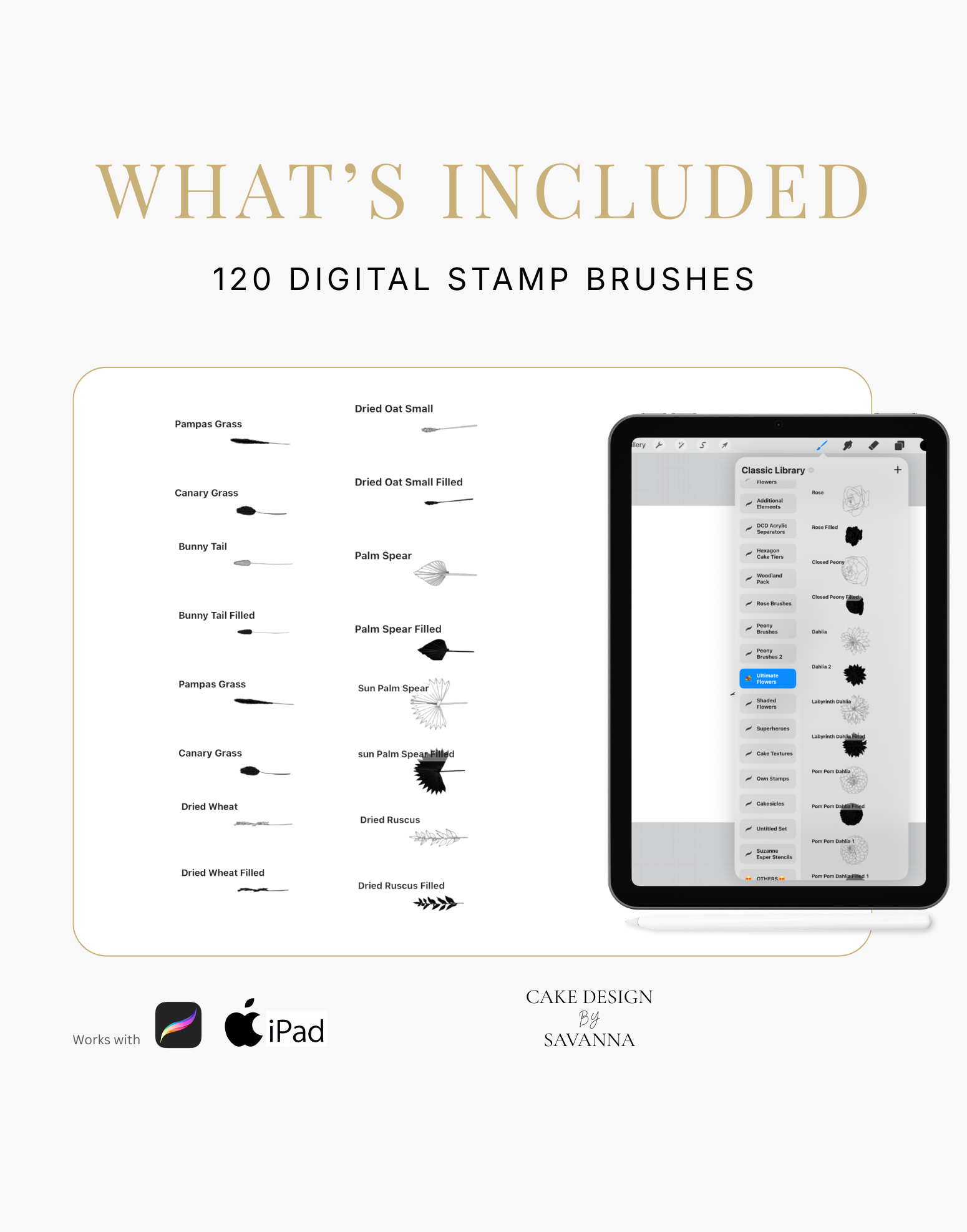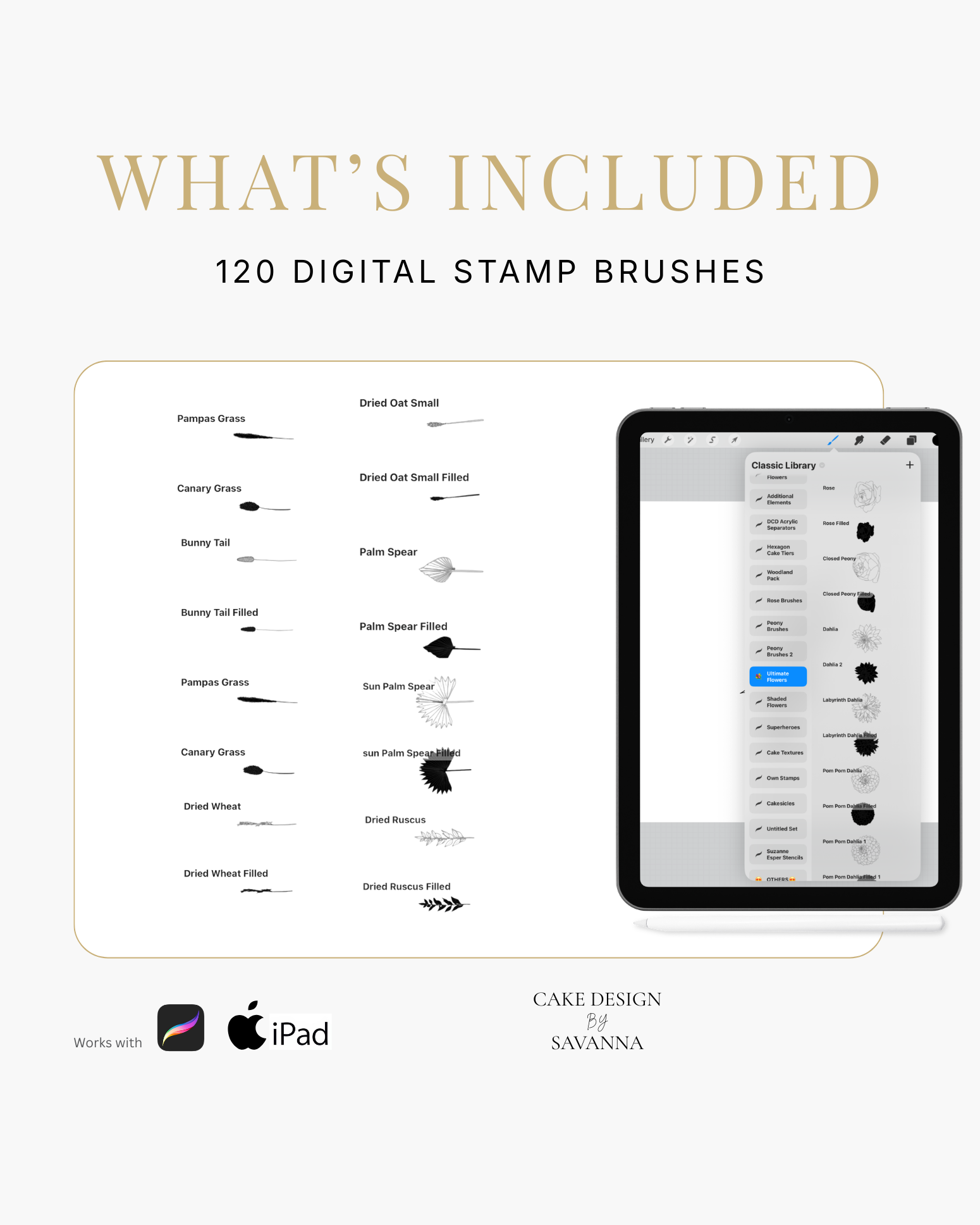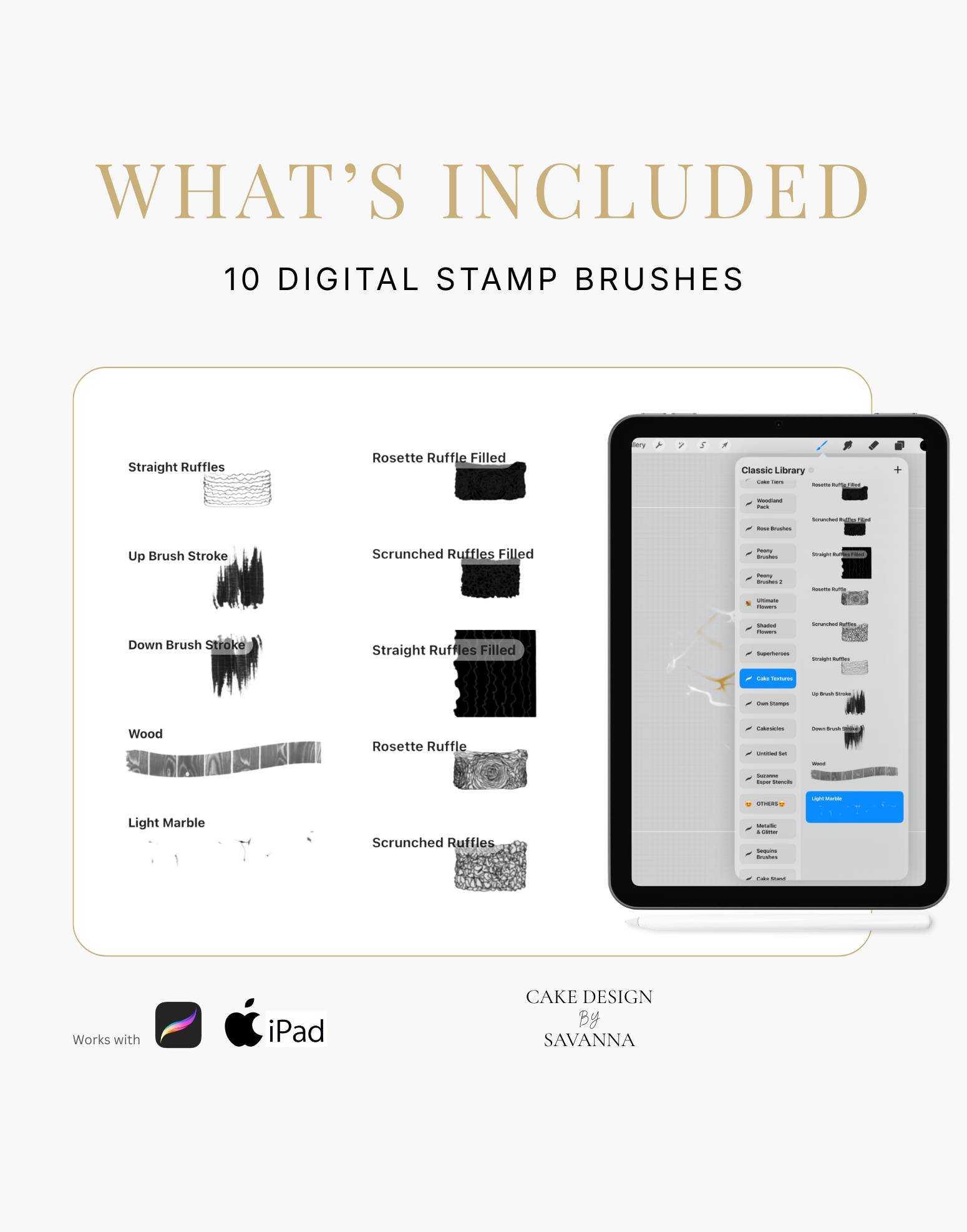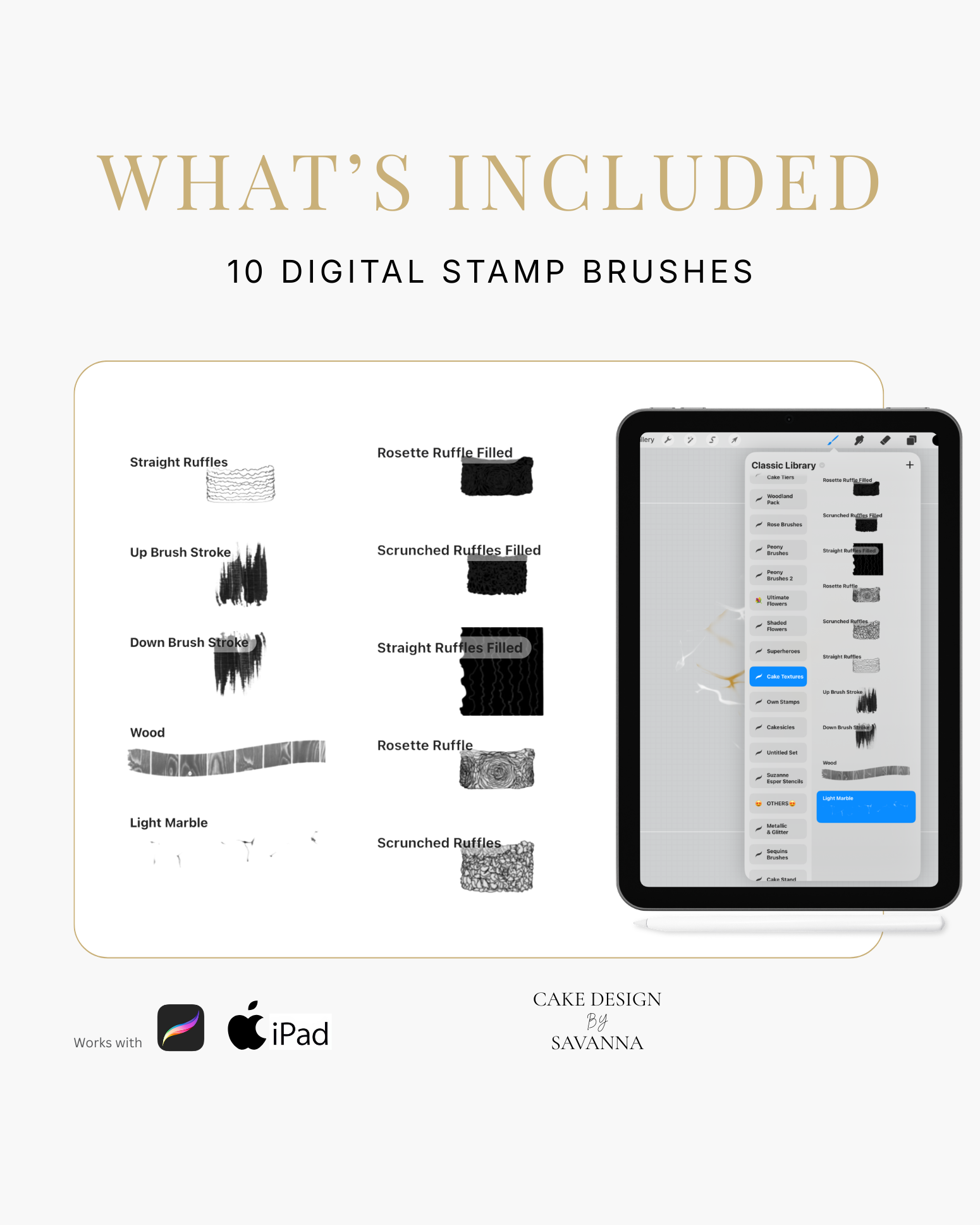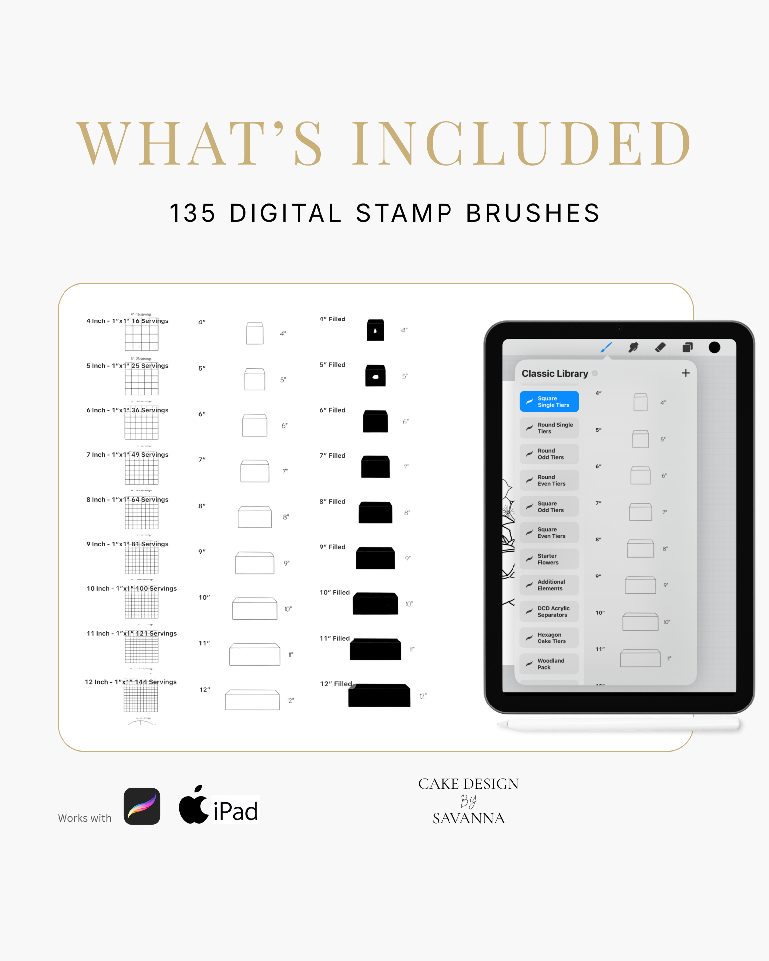 Turn your creative cake ideas into polished design visuals. Specialist stamps and brushes pair with the Procreate app on iPhone and iPad to sketch, refine, and present stunning cake designs with ease.